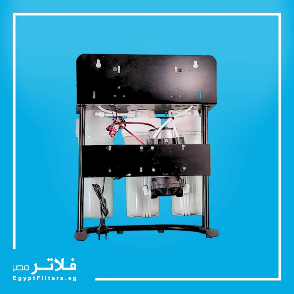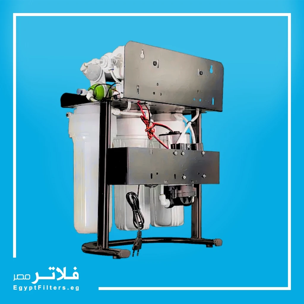 - المرحلة الرابعة: غشاء التناضح العكسي لإزالة 97% من الأملاح والمعادن الثقيلة والبكتيريا والفيروسات، ويعمل بضغط ماء 2-7 بار وينتج 75 جالون/يوم.