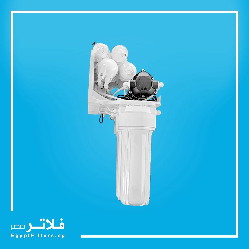 - المرحلة الرابعة: غشاء التناضح العكسي لإزالة 97% من الأملاح والمعادن البكتيريا والفيروسات ويعمل بضغط ماء 2-7 بار وينتج 75 جالون/يوم.